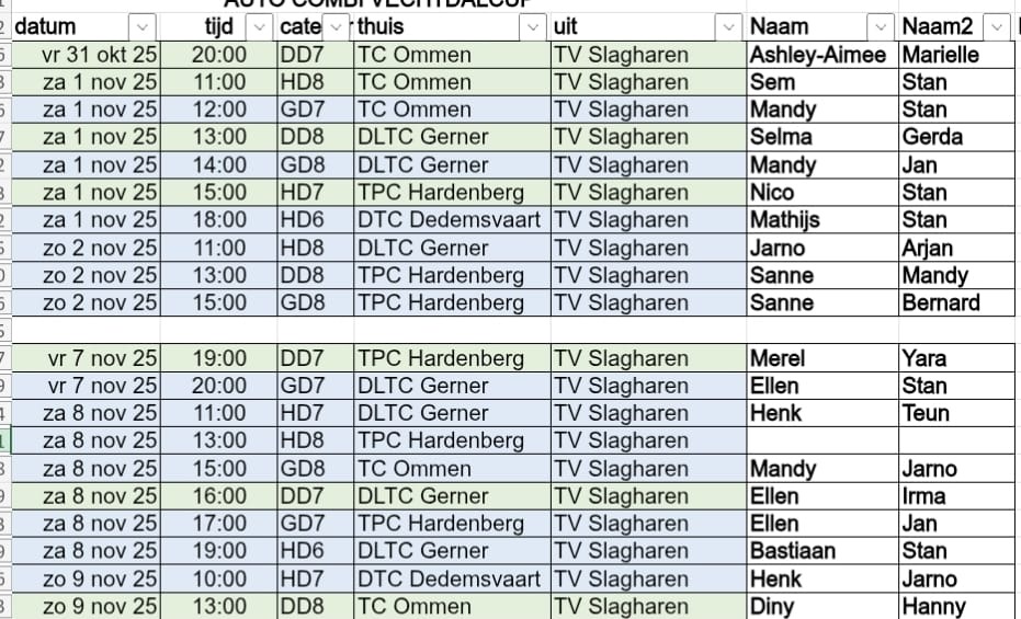 In de bijlage is de indeling met spelers van de Vechtdalcup te vinden. Op één wedstrijd na (zaterdag 8 november herendubbel 8 om 13 uur), is alles ingevuld.