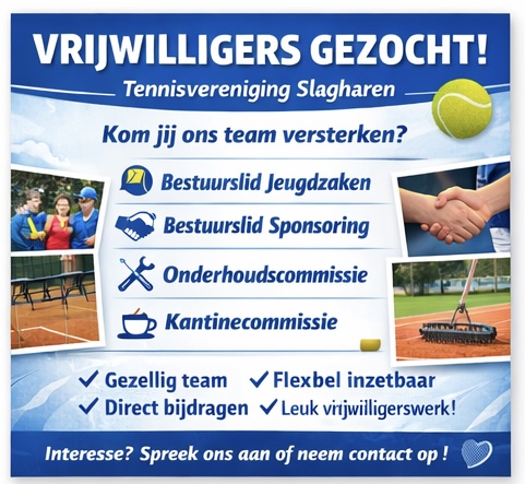 Voor het komende seizoen zijn wij op zoek naar nieuwe mensen die willen bijdragen aan het plezier en de toekomst van Tennisvereniging Slagharen.